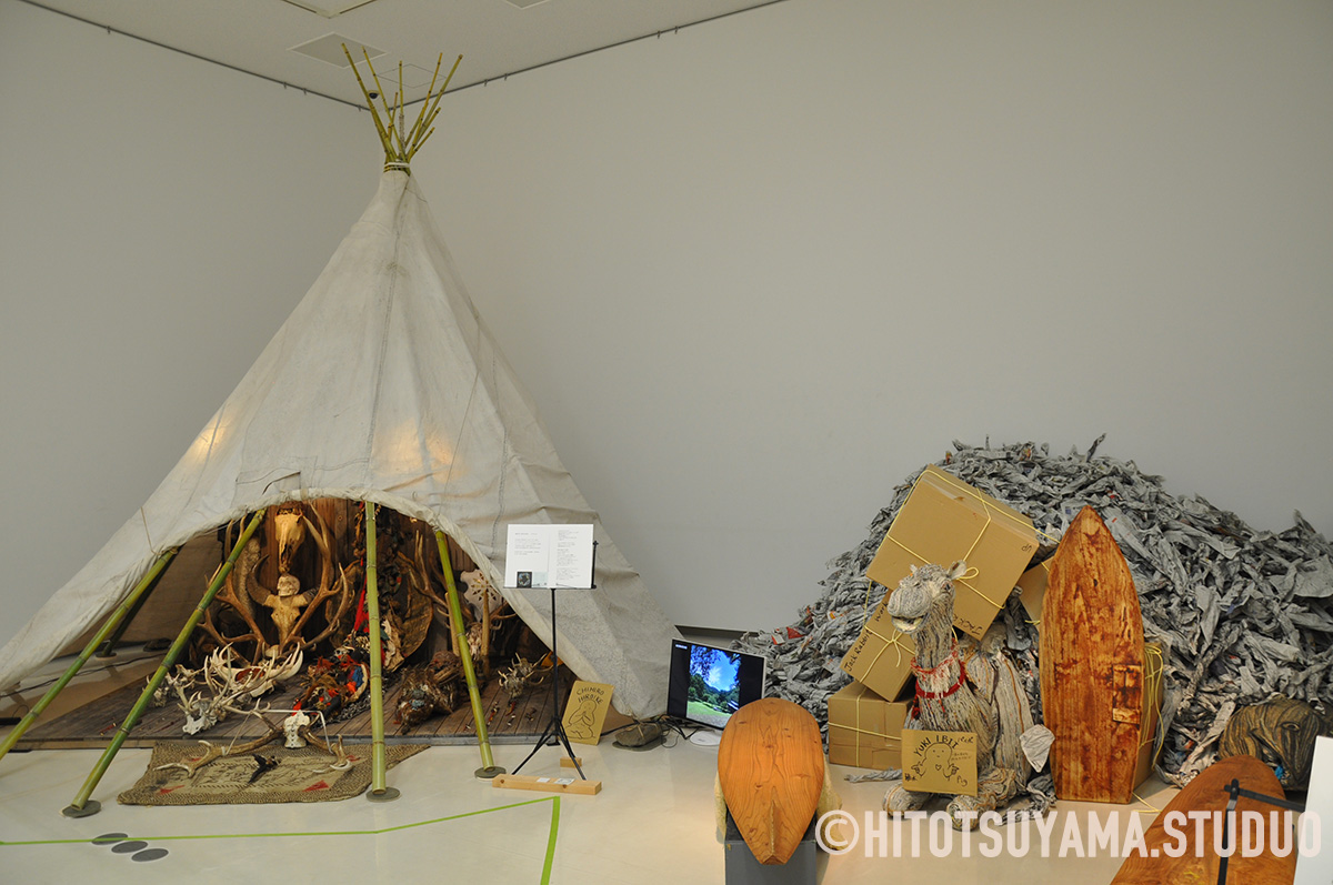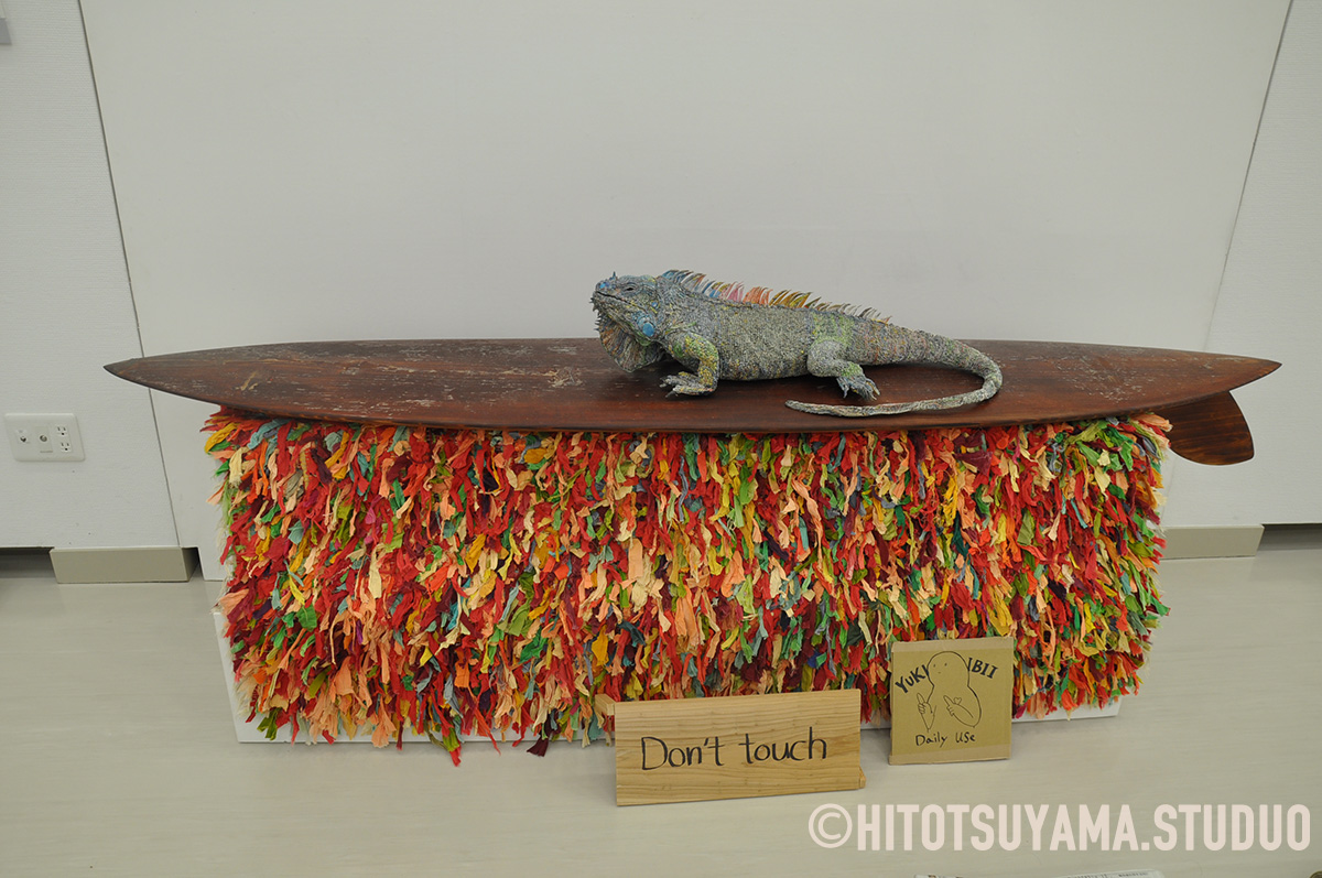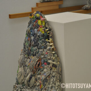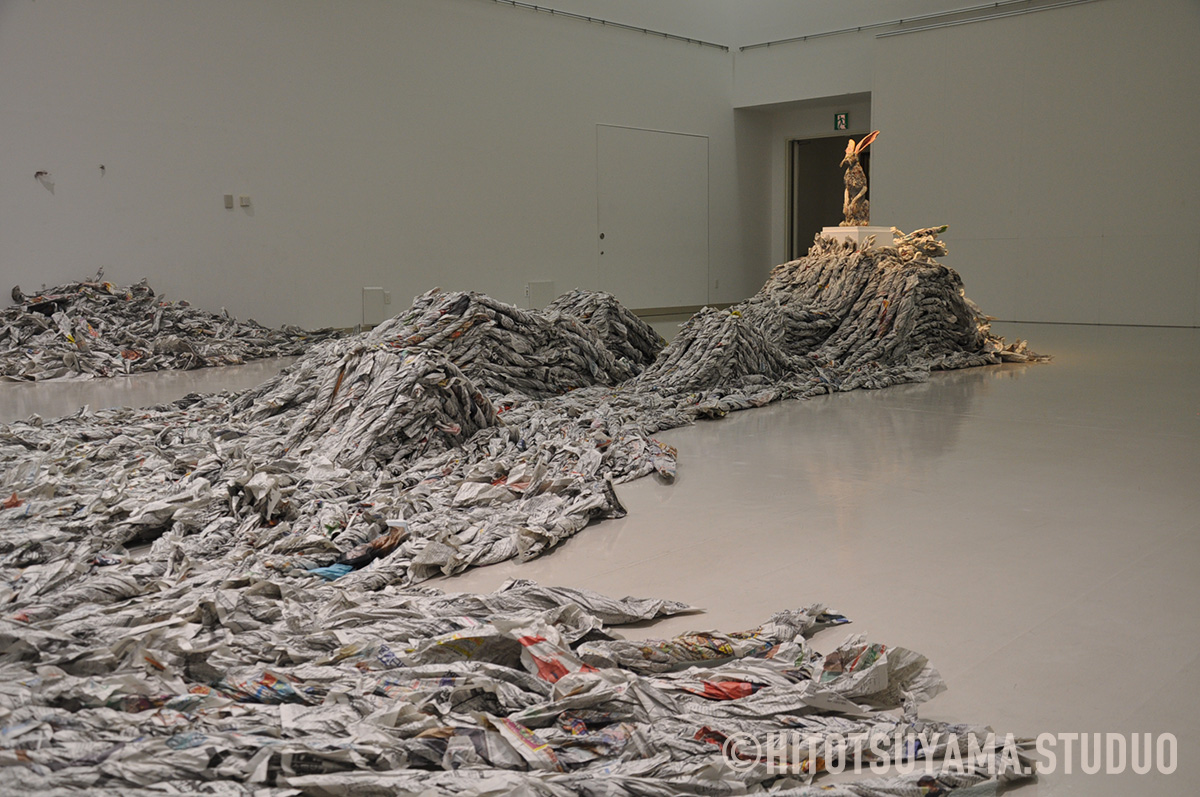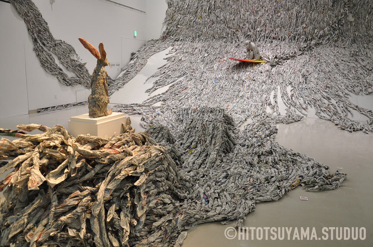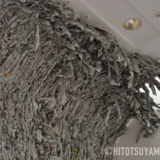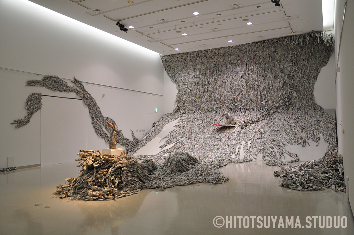 宮崎の自然からインスピレーションを得て、山から海へと続くエネルギーの流れを表現した大型インスタレーション、小さなこよりが積み重なって大きなうねりを形づくり、作品を通して、波動(= いのち)の調和を表現していく。